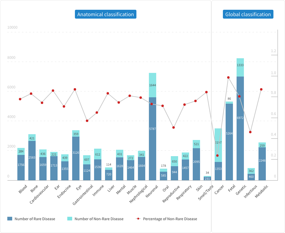 The definition of rare diseases varies across different countries and regions but generally refers to diseases affecting fewer than 1 in 2,000 individuals in the general population. Due to the rarity of individual cases, the progress in rare disease research significantly lags behind that of common diseases, and the classification within and between various rare diseases remains largely unclear. According to the U.S. Food and Drug Administration (FDA), there are over 7,000 known rare diseases worldwide, whereas the more detailed Malacards database lists over 14,000. Globally, there are more than 350 million rare disease patients, with nearly 50% being children. However, among these rare diseases, fewer than 10% have approved treatments or therapies.