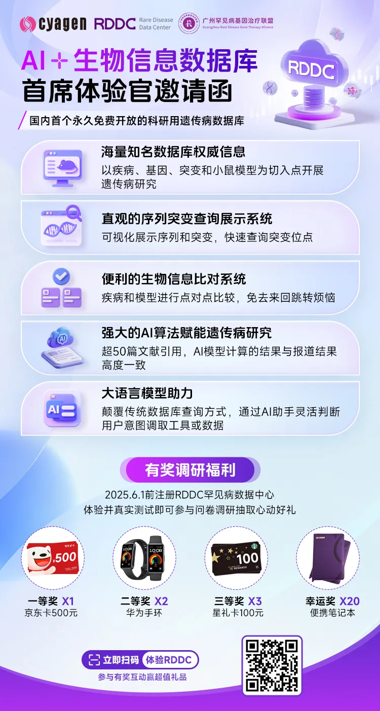 RDDC现向广大科研工作者、医学研究者发出诚挚邀请,招募AI+生物信息数据库首席体验官!只要在2025年6月1日前注册RDDC罕见病数据中心,亲身体验并如实参与问卷调研,就有机会赢取500元京东卡、华为手环、100元星礼卡与精美周边礼品。