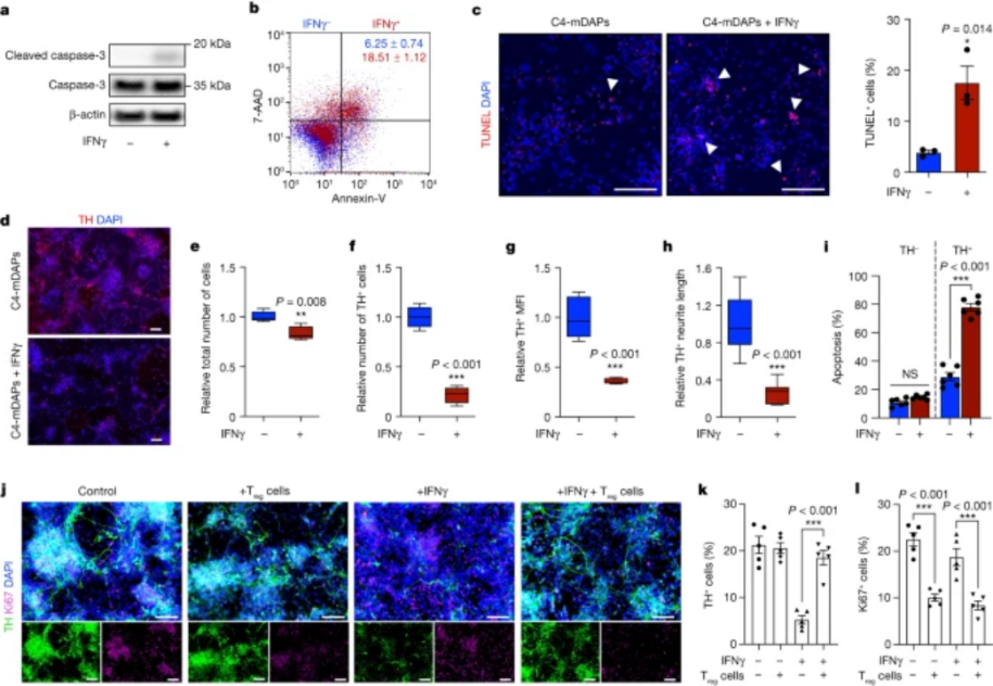 接下来,研究团队分析了共培养后的细胞表达情况,发现针刺创伤急性炎症诱导的促炎细胞因子在体外会优先导致TH mDAN丢失,而这一环节可以通过与Treg细胞共孵育来挽救。