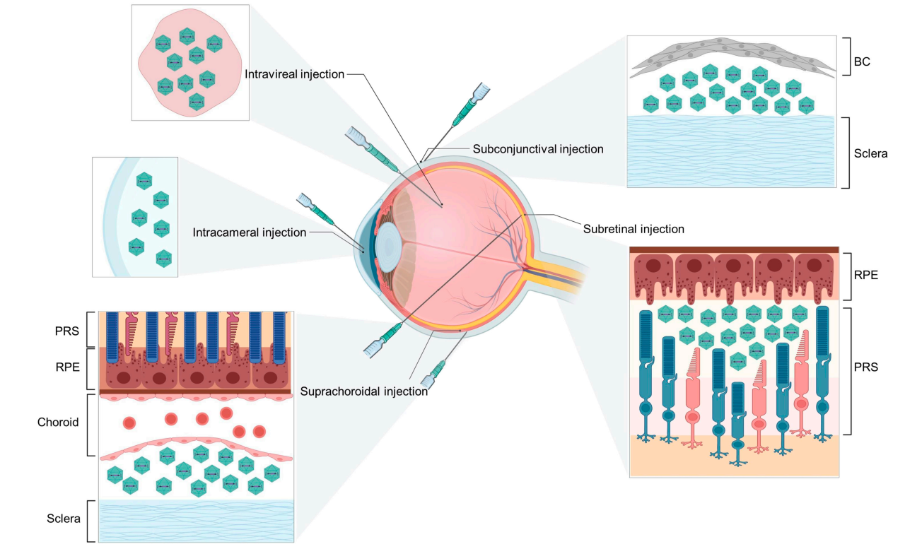 The eye is a complex and precise organ, with various types of tissues and cells each playing their role, enabling people to obtain correct visual information. Different types of eye diseases not only have different pathogenic mechanisms but also affect different tissue locations. Using different delivery methods to accurately target AAV to the lesioned tissue can not only reduce the dosage of AAV, ensuring safety, but also effectively improve the therapeutic effect of AAV-mediated gene therapy, which is another effective way to optimize gene therapy for eye diseases. Subretinal injection has a limited range of action but can accurately and effectively target lesioned tissues in all layers of the retina. Intravitreal injection has a wide range of action but limited effects. Anterior chamber injection can cover tissues such as the cornea, lens, ciliary body, and trabecular meshwork. Subconjunctival injection, suprachoroidal space injection, and others can effectively target their surrounding tissues. Choosing the appropriate AAV delivery pathway for different eye disease tissues can make gene therapy for eye diseases more effective with less effort.