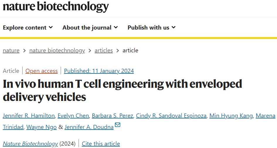 On January 14, 2024, the team led by Jennifer A. Doudna at the University of California, Berkeley, published a research paper titled "In vivo human T cell engineering with enveloped delivery vehicles" in Nature Biotechnology online. This study demonstrated that by displaying antibody fragments on the surface of membrane-derived particles encapsulating CRISPR-Cas9 proteins and guide RNA, which recognize cell surface markers, genome editing tools can be delivered to specific cells.