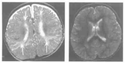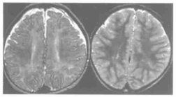 图4.23周BH4D患儿,左图T2WI示额、枕叶髓鞘发育延迟。右图为治疗1年后该患儿的髓鞘发育情况,显示髓鞘发育达到正常同龄儿的水平[2]