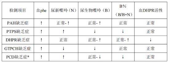 (1)PTPS缺乏症:出生体重多偏低,尿新喋呤(N)明显增加,生物喋呤(B)明显降低,B%<10%(多<5%),BH4负荷试验其血Phe浓度在服用4~6小时下降至正常,PTS基因检测到变异。