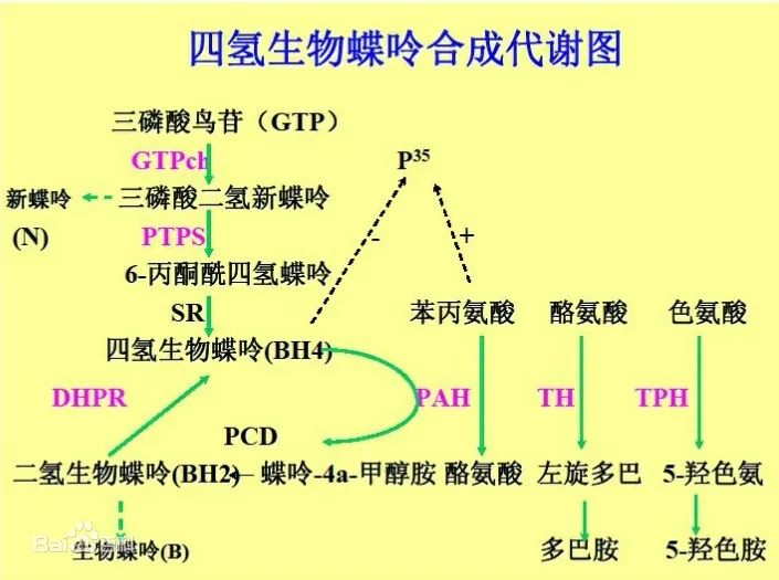 四氢生物喋呤(tetrahydrobiopterin,BH4)是一种芳香族氨基酸羟化酶的辅助因子,其合成或代谢途径中酶的先天性缺陷会是导致BH4D的罪魁祸首,造成神经递质合成受影响,出现高苯丙氨酸血症(HPA)以及严重的神经系统损害症状和智能障碍。BH4D是HPA的一种亚型,是一种常染色体隐形遗传病,与PKU同属于HPA[1]