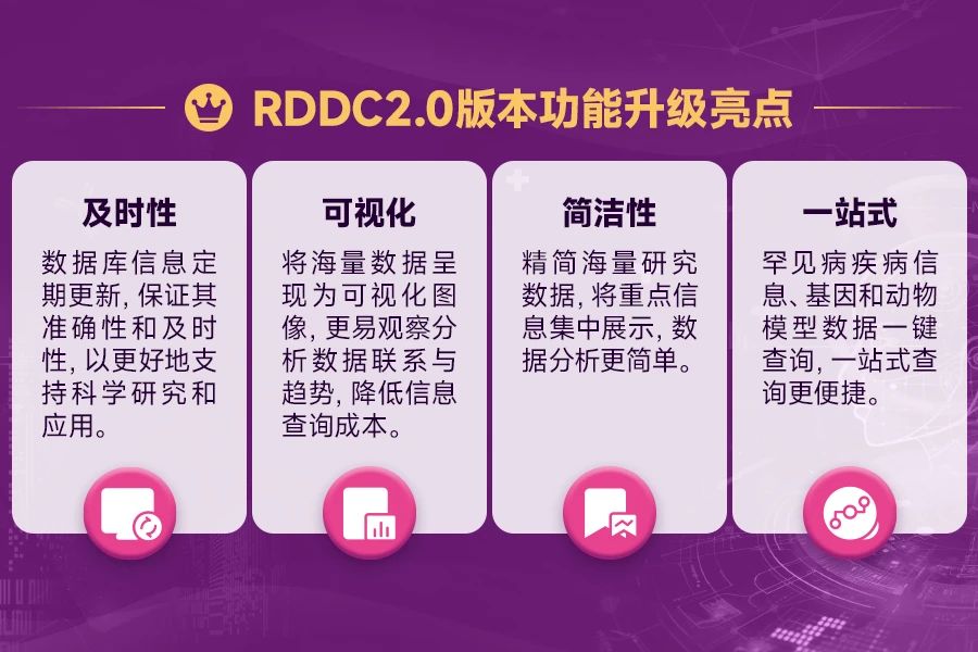 RDDC是由广州罕见病基因治疗联盟理事长单位清华珠三角研究院和副理事长单位赛业生物联合开发,全面整合了NCBI、Uniprot、ClinVar、ENSEMBL等众多国际知名数据库的权威信息,让用户能够在最短时间内完成:从靶点基因发现,到靶点基因的表型和功能查询,以及选择获得当前市场上和靶点基因表型高度相关的动物模型,从而快速制定研究路线,开展针对疾病致病基因的科学研究和药物发现工作。截止发稿当日,共计收录疾病数21366;收录基因数65277;收录模型数97001。