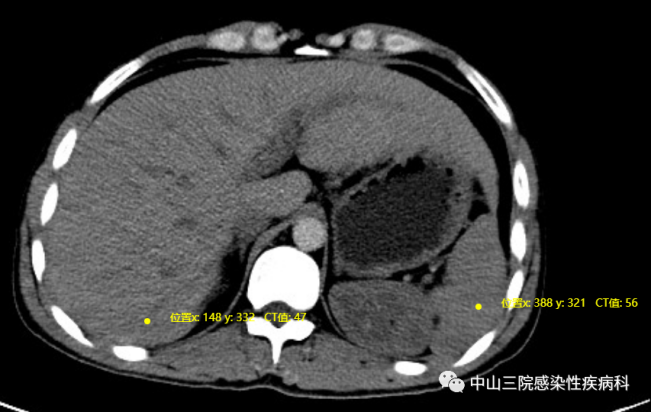 图4.腹部CT未见肝硬化或脾大,肝脏密度弥漫性降低(图源:中山三院感染科)