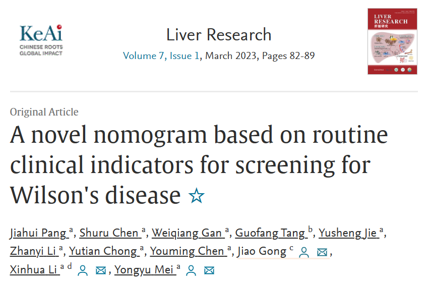 2023年2月,中大三院感染性疾病科遗传代谢性肝病团队在Liver Research在线发表题为“A novel nomogram based on routine clinical indicators for screening for Wilson’s disease”的研究论文。该研究纳入了90例肝豆状核变性患者及128例肝功能异常的非肝豆状核变性患者的资料,使用6个临床上常用的指标构建了用于识别肝豆状核变性的预诊模型,可以帮助减少肝豆状核变性的漏诊误诊率。“像喀什地区市县级基层医院由于经费有限无法为患者提供较为昂贵的全外显子测序检测,使用该模型可以在一定程度上起到替代作用,帮助他们提高肝豆状核变性的诊断率。”