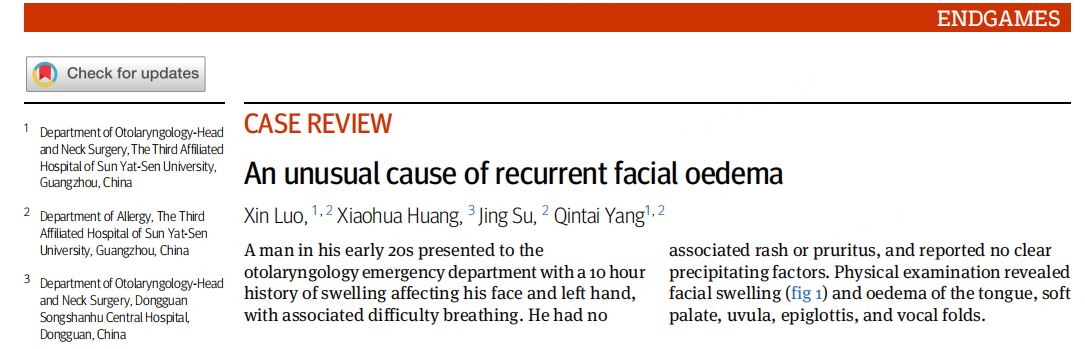 近期,中山大学附属第三医院杨钦泰教授团队在国际顶级医学期刊《The British Medical Journal》上发表了一篇关于遗传性血管性水肿(HAE)病例的研究报告。该患者因喉头水肿反复发作导致窒息而行气管切开手术,并长期带管生活。经过杨钦泰教授团队的明晰诊断和规范化管理,最终患者拔管出院,积极回归正常生活[2]。该病例为全球罕见病治疗贡献了中国智慧和方案。为此,本期联盟将分享中山大学附属第三医院院长杨钦泰教授以及该团队冯佩英教授对于这一经典案例的深度解读内容,方便大家进一步了解HAE规范化诊疗。本期内容来源于“医学界篇皮肤科频道”。
