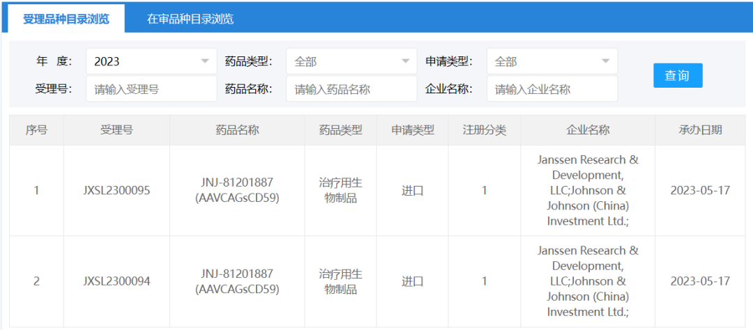 5月17日,国家药监局药品审评中心(CDE)官网显示,强生旗下杨森制药公司申报的“JNJ-81201887 (AAVCAGsCD59)”临床试验申请,已经获得受理。