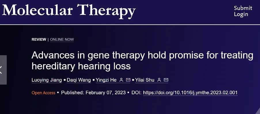 2023年4月5日,复旦大学附属眼耳鼻喉科医院舒易来教授团队在美国细胞与基因治疗学会会刊 Molecular Therapy上发表了题为:Advances in gene therapy hold promise for treating hereditary hearing loss 的综述论文。