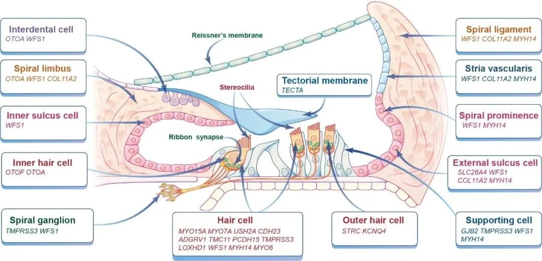 超过一半的耳聋基因在耳蜗毛细胞中表达,因此毛细胞更受到基因治疗的关注。耳蜗内有两种类型的毛细胞:对声音做出反应的单排内毛细胞(inner hair cells,IHCs)和放大声音的三排外毛细胞(outer hair cells,OHCs)。在HCs的顶端表面有一束用于机械电转导的静纤毛;在HCs的基底有负责将神经递质释放到SGN的带状突触。常见主要表达于内外毛细胞的基因包括MYO15A、MYO7A、USH2A、CDH23、MYO6、TMC1、PCDH15等。然而,另外一些基因则主要表达于IHCs或OHCs。例如,对带状突触的神经传递至关重要的OTOF和对传入突触的谷氨酸释放至关重要的VGLUT3主要在IHCs中表达,而对毛束凝聚至关重要的STRC、对钾离子稳态至关重要的KCNQ4和对细胞核定位至关重要的SYNE4基因主要在OHCs中表达。