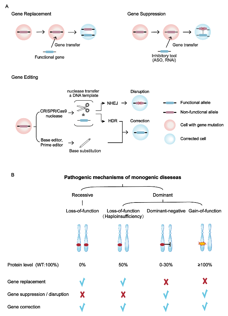 图2单基因疾病的基因治疗策略。(A) 三种主要的基因治疗策略。(B)单基因疾病的发病机制及对应的基因治疗方法。