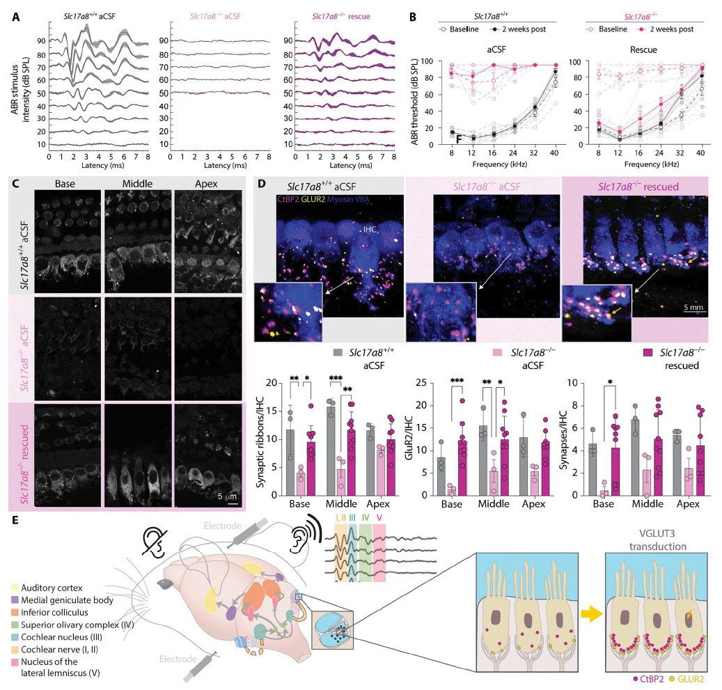 除了DNA编辑器,舒易来联合杨辉教授团队开发出了既不切割DNA,也不切割RNA的RNA碱基编辑器治疗策略,可在RNA水平进行碱基的精确校正。该研究团队研究了基于Cas13的RNA ABE在Myo6C442Y/+小鼠的治疗效果,研究结果表明该RNA编辑系统能够纠正突变的Myo6等位基因,并恢复小鼠听觉功能,证明了RNA碱基编辑器在治疗遗传性耳聋中的重要价值。