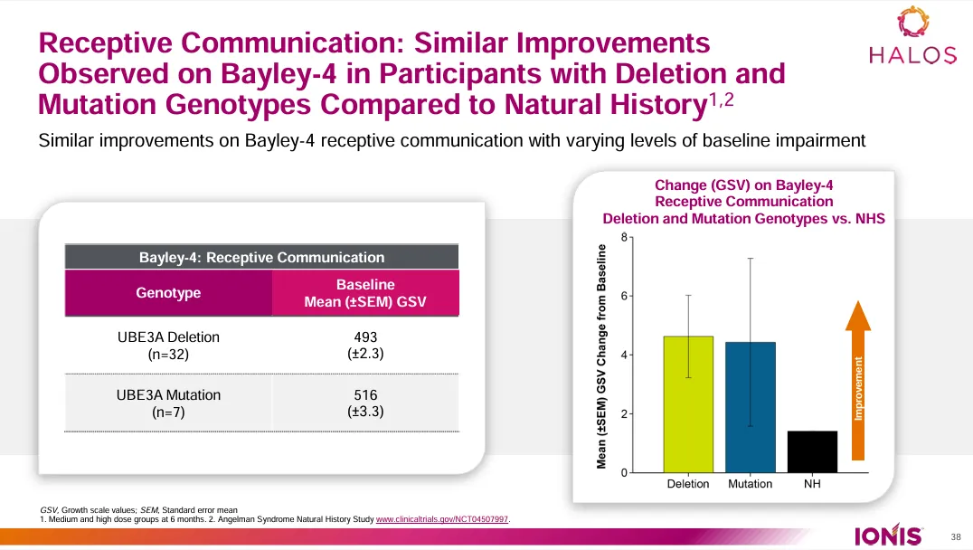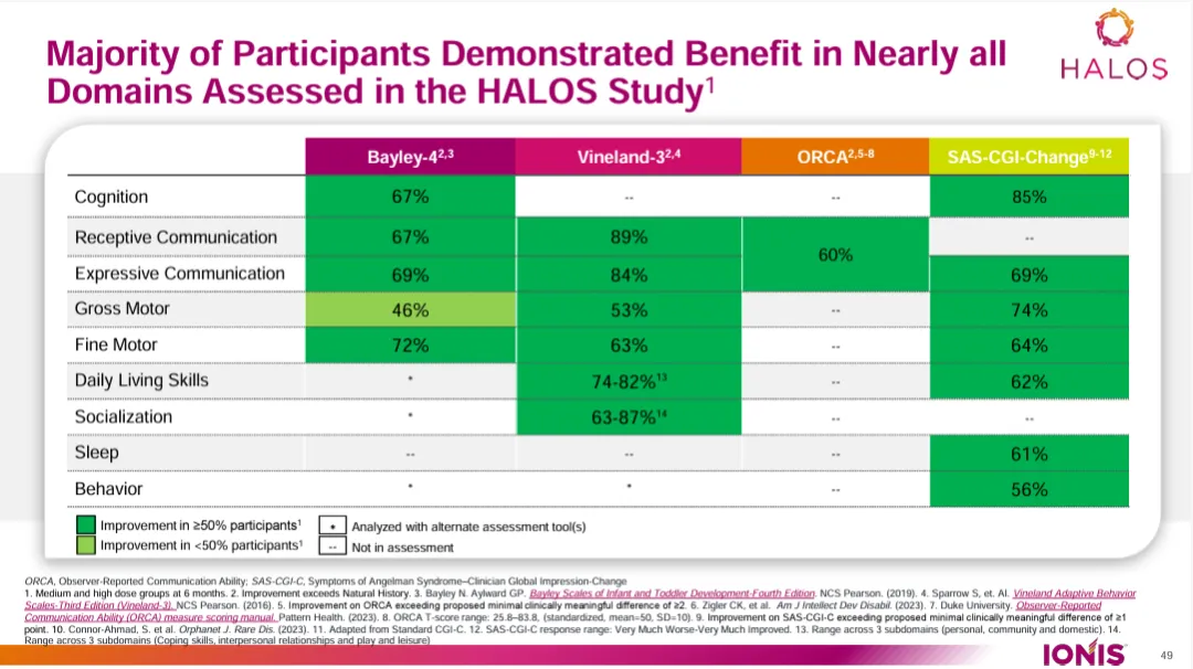 HALOS试验是一项全球、开放标签试验,共纳入了51名AS患者,患者年龄在2至50岁之间。这次所公布的结果来自试验6个月时,MAD部分最后一个时间点的数据。结果显示,在所有年龄和基因型的患者中都观察到ION582治疗一致地改善患者的关键功能。在试验第4个月时,由临床医生所评估的Bayley-4认知评估分数显示,患者的沟通、认知和运动功能的改善超过了天使综合征自然史研究(NHS)中的患者。