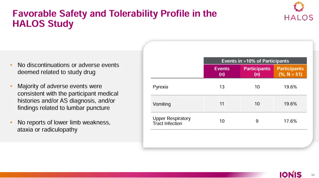 ION582在所有剂量水平下均表现出良好的安全性和耐受性。没有患者因药物相关不良反应而终止研究。