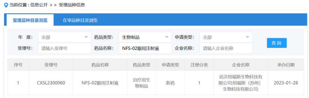 2023年1月28日,国家药监局药品审评中心(CDE)官网显示,纽福斯生物的“NFS-02眼用注射液”临床试验申请,已经获得受理。