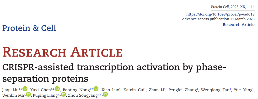 近日,联盟单位——微光基因(苏州)有限公司团队及中山大学生命科学学院的松阳洲教授团队在Protein & Cell杂志发表题为CRISPR-assisted transcription activation by phase-separation proteins的文章,首次将dCas9-VPR(VP64-P65-RTA)转录激活系统与相分离蛋白的IDR(intrinsically disordered region)融合, 证明相分离蛋白辅助的CRISPRa系统可以显著提高哺乳动物细胞中內源基因的表达激活效率,并且该系统具有更宽的gRNA设计窗口(转录起始上游>200 bp)及更低的DNA链靶向偏好性,同时也具有较高的靶向特异性。该研究为精准靶向的转录调控工具的开发与优化提供了新思路;开发的高效转录激活工具在大部分靶位点优于现有激活工具,且作用元件更为简洁;在遗传疾病的治疗应用方向有很大潜力。