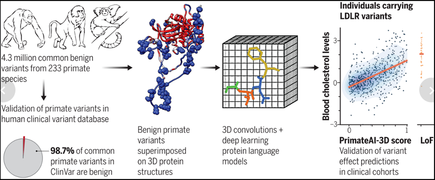 研究解决了变异解析领域的一个重要挑战,即缺乏足够的标记数据以有效地训练大型机器学习模型。通过生成了迄今为止最全面的灵长类动物测序数据集,并将该资源与利用三维蛋白质结构的深度学习架构相结合,实现了在多个临床基准测试中变异效应预测的显著改进。