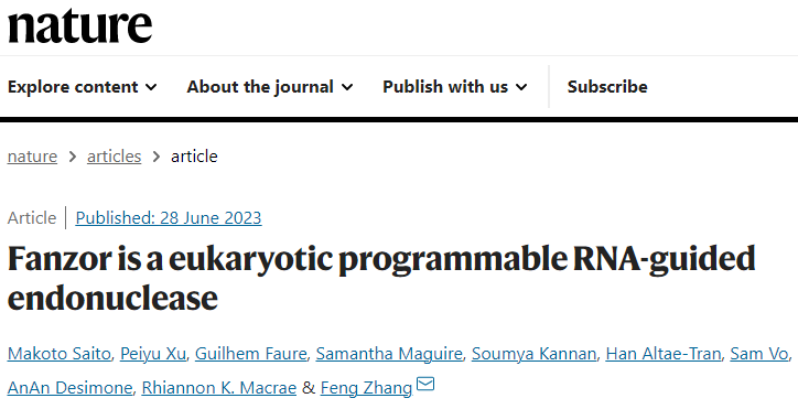 近年来,科学家们一直在探索真核生物中是否存在与CRISPR系统类似的机制。2023年6月28日,张锋团队的研究在Nature期刊上发表题为“Fanzor is a eukaryotic programmable RNA-guided endonuclease”的研究论文,报道了在真核生物中发现的第一个RNA引导的DNA切割酶——Fanzor,而且该新型CRISPR样系统还可以被重编程用于对人类基因组的编辑。