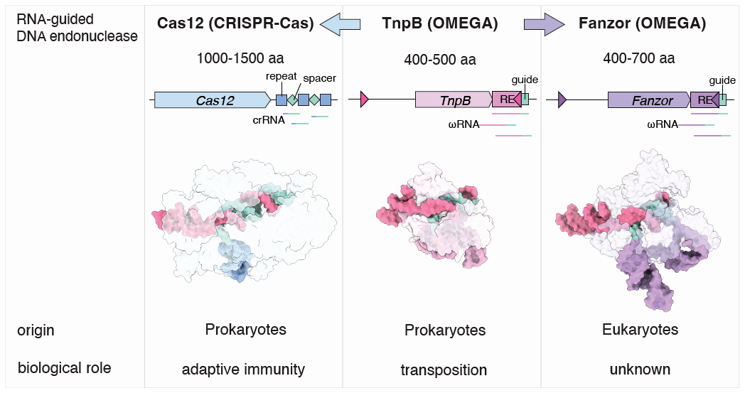 与CRISPR系统的核酸酶不同的是,Fanzor酶被编码在真核生物基因组的转座子中,经过系统发育分析,Fanzor基因被认为是通过水平基因转移从细菌转移到真核生物中。