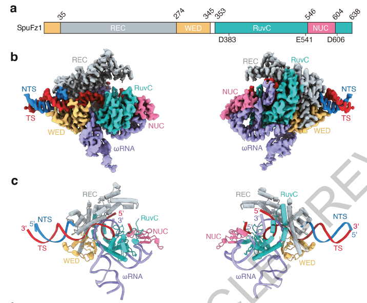图3.Fanzor蛋白与ωRNA复合物及其靶DNA的冷冻电镜结构,Fanzor蛋白不同结构域用灰色、黄色、浅蓝色和粉红色表示,