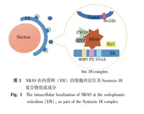 上述囊泡的转运过程受到许多因子的调控,其中可溶性N-乙基马来酰亚胺敏感因子结合蛋白受体(soluble ethylmaleimide-sensitive factor attachment pro-tein receptors,SNARE)发挥了重要作用。典型的SNARE蛋白是位于囊泡或靶膜上具有N端胞质结构域的跨膜蛋白,其功能是介导转运囊泡与靶膜的停靠和融合[7]。根据分布位置的不同,SNARE主要分为两类,分别是位于转运囊泡上的v-SNARE(vesicle-membrane SNARE)和位于靶膜上的t-SNARE(target-membrane SNARE),这一对特定的SNARE蛋白之间的特异性识别促进囊泡与靶膜的融合[7]。Syntaxin 18(STX18)是定位于内质网的一个重要t-SNARE,是一种多结构域蛋白,通过与其他t-SNARE蛋白(p31、BNIP1)及外周膜蛋白(ZW10、RINT1、Sly1)共同组成Syntaxin 18复合体[8]。后者是酵母中Ufe1p复合体的同源物,主要功能是介导高尔基体至内质网的囊泡逆向转运[9]。2009年Aoki等[10]研究发现,NBAS基因编码蛋白亦是Syntaxin 18复合体的一个重要亚单位。NBAS蛋白与酵母中Ufe1p复合体的组成亚基Dsl3p/Sec39p具有一定的相似性。在促进SNARE复合物解聚条件下,NBAS可从Syntaxin 18复合体中释放,但仍保留在p31-ZW10-RINT-1亚复合物中。NBAS蛋白与其他成分结合形成Syntaxin 18 复合物,其功能是作为一个栓系蛋白接收从高尔基体逆向转运至内质网的囊泡。研究表明NBAS蛋白的N端和C端区域分别与Syntaxin 18复合体中p31的N端和ZW10-RINT-1相互作用,以桥联p31与ZW10-RINT-1的连接(图1)[10]。敲低NBAS蛋白后,p31的表达水平随之显著下降,证明二者之间的相互作用[10]。2015年,亦有研究在成纤维细胞中观察显示,与对照组相比,NBAS基因突变导致参与内质网应激反应的基因表达显著增加,提示抑制逆行运输可能导致内质网应激反应[11]。然而NBAS在逆向转运中的具体分子机制仍不明确。