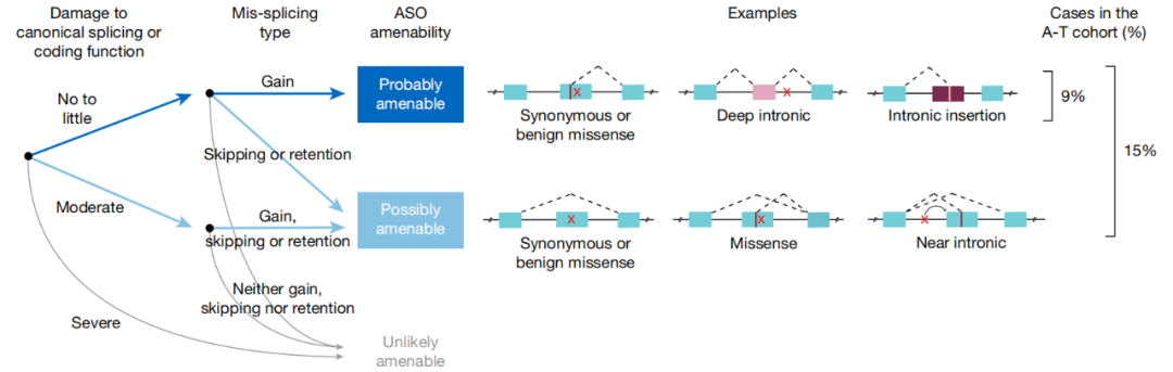 该研究开发了一种预测分类法来评估每个患者对剪接转换ASO的适应性,并表明15%的毛细血管扩张性共济失调综合征(A-T)患者可通过个性化ASO治疗干预得到恢复。这些研究结果为前瞻性识别可能受益于涉及ASO的治疗方法的遗传性疾病个体提供了一个框架。