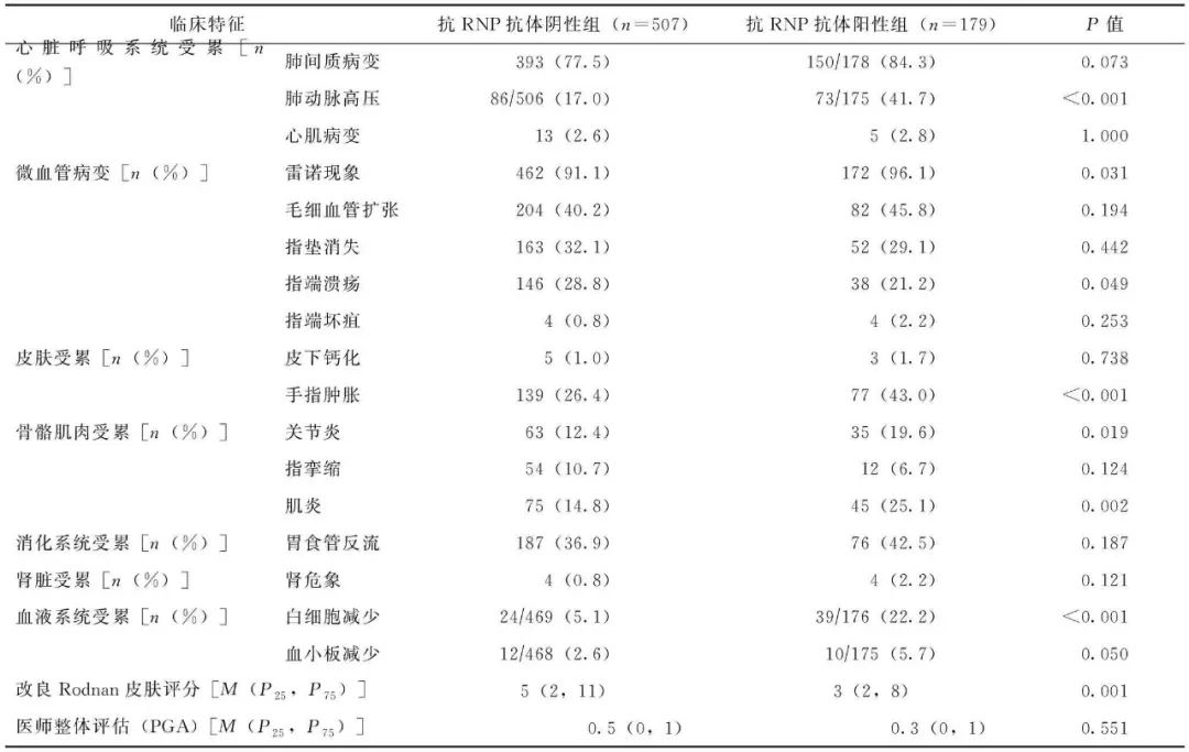 结论:抗RNP抗体阳性SSc患者有着较为独特的临床表现,发病年龄更早,皮肤硬化较轻,肺动脉高压更常见,需要引起临床医生的重视。