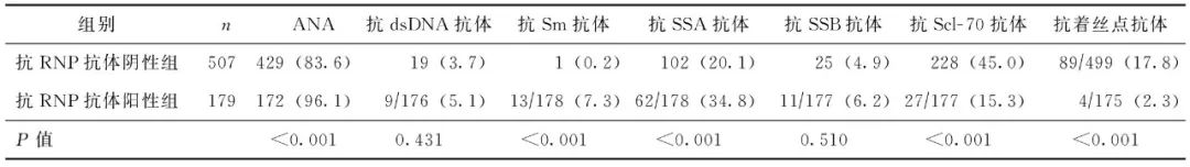 表3.不同抗RNP抗体SSc患者自身抗体阳性比较[n(%)]