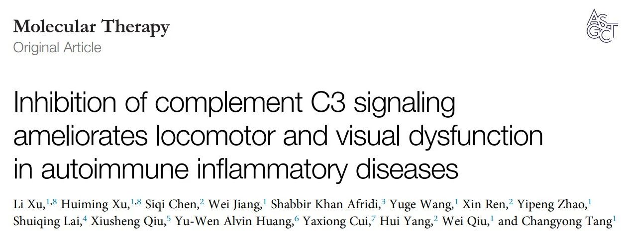 近日,中山大学附属第三医院脑病中心邱伟教授和汤常永副研究员团队在国际知名期刊Molecular Therapy(中科院一区,TOP期刊,IF=12.4)发表了题为“Inhibition of complement C3 signaling ameliorates locomotor and visual dysfunction in autoimmune inflammatory diseases”的研究论文。该研究通过临床数据收集、血液样本检测、转录组测序分析(RNA-seq)、细胞和组织免疫荧光染色等方法,多层次验证了补体C3信号在NMOSD患者和动物模型中被显著激活;而抑制补体C3信号通路的激活能够显著改善NMOSD动物模型中局部组织的典型病变及运动和视功能障碍。