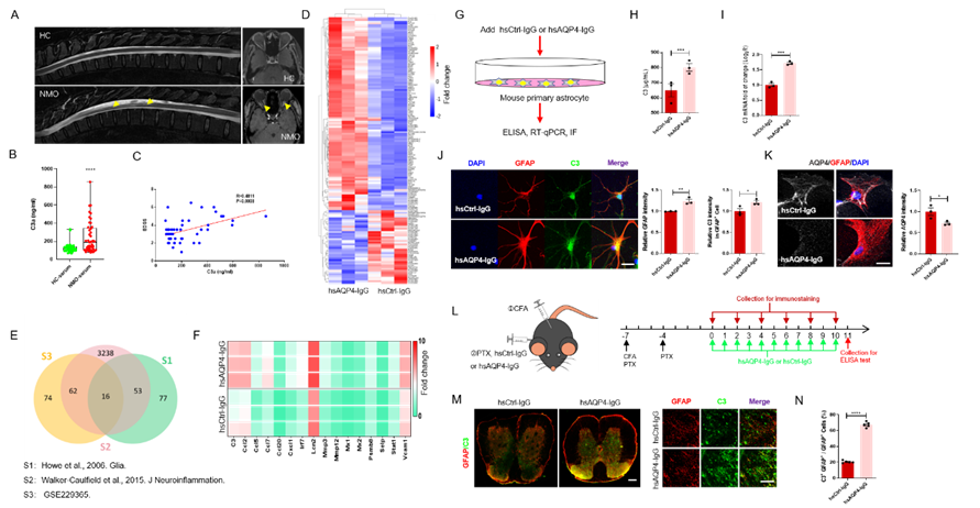 NMO-IgG刺激的星型胶质细胞显著增加C3的表达和分泌:该研究首先通过对NMOSD患者的血清进行Elisa检测,发现NMOSD患者血液中C3的活性分割产物C3a的含量较对照组显著升高,且与临床神经运动功能障碍相关评分(EDSS)成正相关(P=0.0008)(图1A-C);利用患者来源的纯化NMO-IgG处理星型胶质细胞进行RNA-seq测序分析,发现补体C3的表达显著上调(图1D-F);进一步通过检测NMOSD体外细胞及动物模型中C3的表达情况,确定了星型胶质细胞在NMO-IgG的刺激下显著增加C3的表达和分泌(图1G-N)。