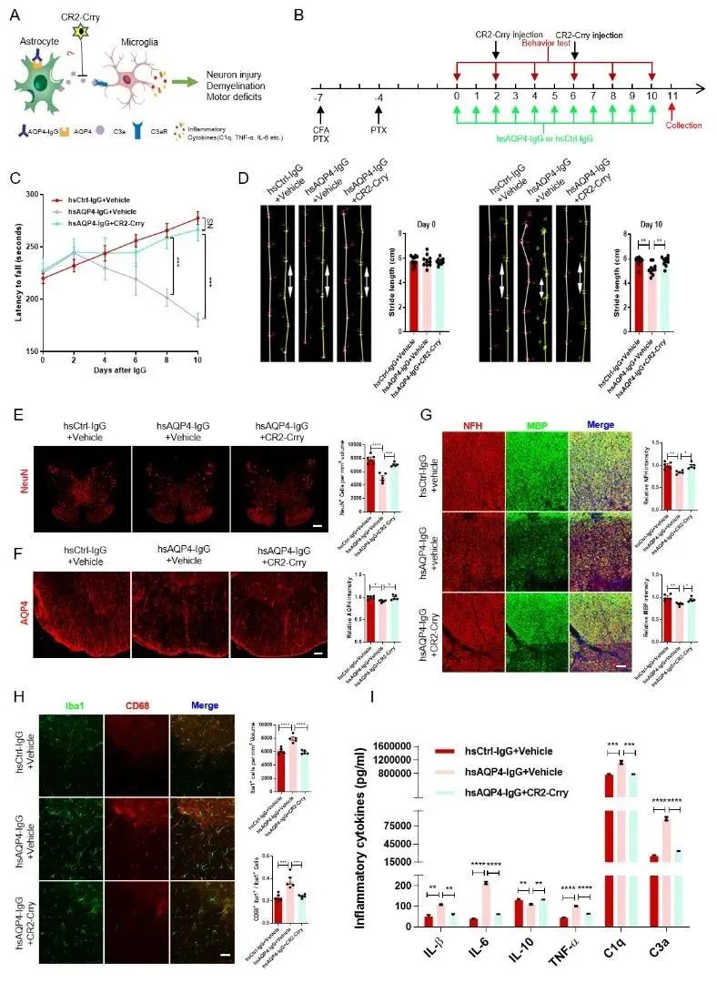 图3 CR2-Crry减轻小鼠脊髓中NMOSD的典型病变并缓解相关的运动功能障碍