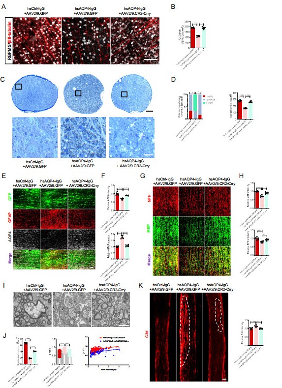 基于腺相关病毒(AAV2/9)靶向抑制C3信号通路,可改善NMOSD相关的视功能损害和视神经炎性病变:最后,该课题组构建了CR2-Crry过表达腺相关病毒(AAV2/9.CR2-Crry),利用NMOSD视神经局部模型,探究了抑制C3信号通路对NMOSD相关视功能障碍的作用。结果显示:相较于NMOSD疾病组,AAV2/9.CR2-Crry治疗组在视觉诱发电位(Visual evoked potentials, VEP)和视网膜电图(Electroretinography, ERG)中的视功能得到明显提高(图3);免疫荧光分析发现视网膜细胞和神经节细胞数量明显增加(图4A-D),AQP4和MBP的脱失减少(图4E-H),C3活性产物C3d的沉积减少(图4K);视神经组织电镜结果提示:AAV2/9.CR2-Crry显著减轻局部组织的髓鞘破坏(图4I-J)。