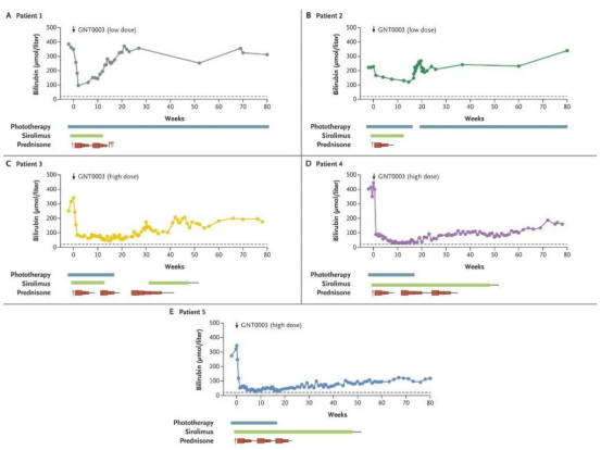GNT0003推动了一种治疗困难病症的潜在方法。迄今为止,没有药物被批准用于治疗CN综合征。光疗法仍然是严重CN患者长期护理的支柱,严重患者可能需要每天接受长达12小时的光疗,通过蓝色LED灯来分解身体无法分解的胆红素,但患者仍然存在胆红素脑病和神经系统后遗症的高风险,且光疗的有效性可能会随着年龄的增长而逐渐下降,导致更长的光疗持续时间。目前治疗这种疾病的唯一治愈方法是原位肝移植 (OLT) ,但面临着例如供体肝脏的可用性有限,需要终身免疫抑制以免发生排斥反应等局限性,因此极少有患者用此方法进行治疗。生活质量的限制和当前治疗的副作用清楚地表明了基因疗法等新方法的价值。