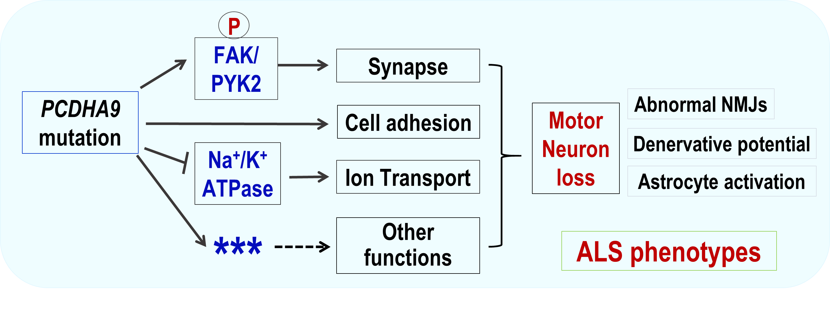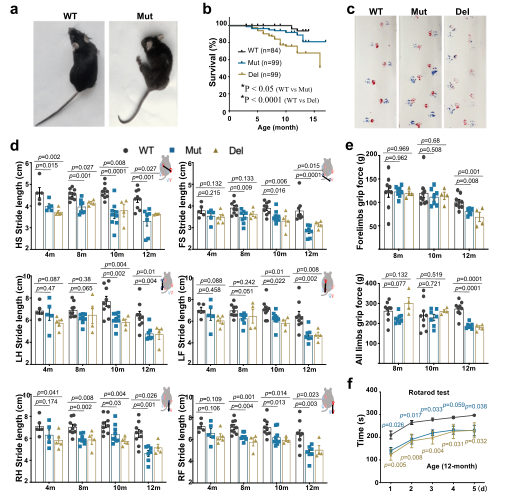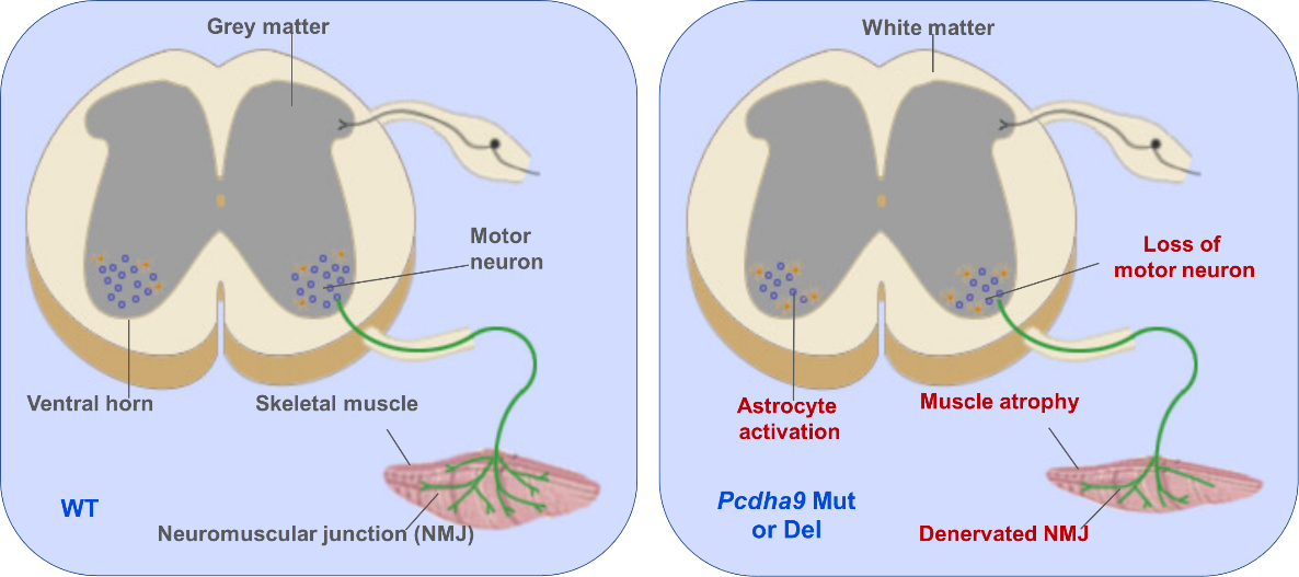 肌萎缩侧索硬化症(ALS)是一种常见的神经退行性疾病,其发病原因和机制仍未彻底阐明。我们通过全外显子和高深度靶向测序,在中国散发ALS队列中发现多名携带PCDHA9同一纯合变体(p.L700P)的患者。通过构建携带该同源点突变或基因缺失突变的Pcdhα9突变小鼠,发现其出现进行性脊髓运动丧失、肌肉萎缩和神经肌肉接头的结构/功能异常,导致瘫痪和早期死亡。进一步证明,Pcdhα9突变导致衰老脊髓中FAK和PYK2的异常激活,并显著降低运动神经元中NKA-α1的表达。同时,单核多组学分析揭示在衰老的突变小鼠中与细胞黏附、离子转运、突触组织和神经元存活有关的信号紊乱。该研究为本病尤其是散发型患者的遗传咨询提供了新的证据,也可能为未来的治疗提供全新的靶点。