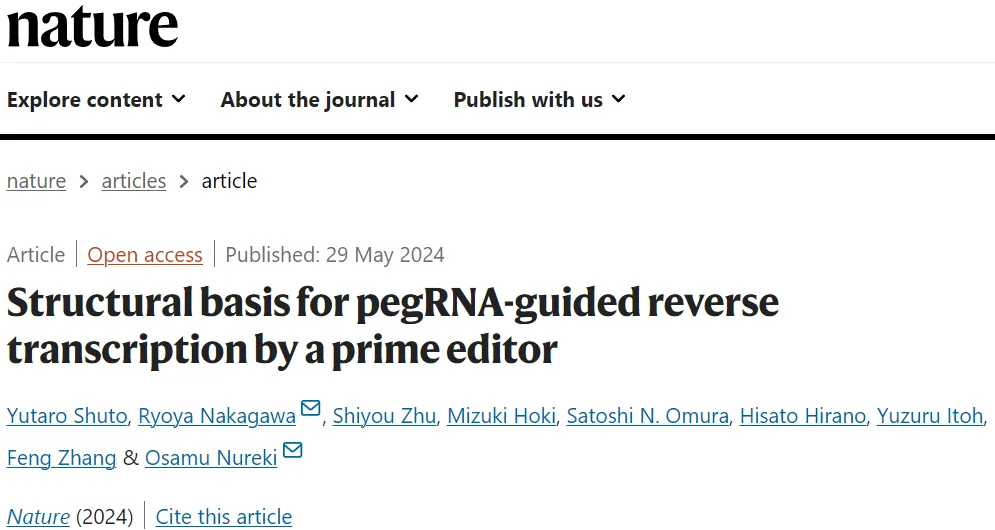 2024年5月29日,东京大学Osamu Nureki及博德研究所张锋等团队合作在Nature 在线发表题为“Structural basis for pegRNA-guided reverse transcription by a prime editor”的研究论文,该研究展示了SpCas9-M-MLV RTΔRNaseH-pegRNA-target DNA复合物在多种状态下的冷冻电镜结构。终止结构以及功能分析表明,M-MLV RT将逆转录延伸到预期位点之外,导致支架衍生的结合,从而在目标位点上引起不希望的编辑。