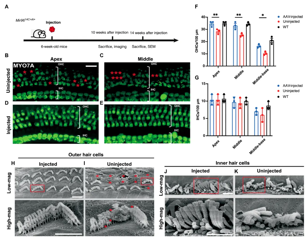 AAV2-SaCas9-KKH-sgRNA4递送到成年Mir9614C>A/+小鼠的耳蜗中,可促进毛细胞存活以及维持静纤毛的完整性