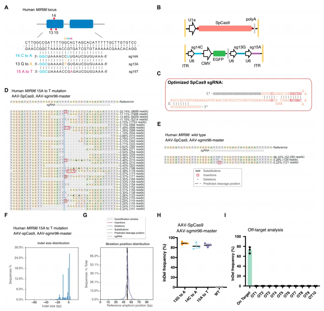携带多个sgRNA的双AAV系统,可有效靶向人类细胞中所有已知的MIR96种子区突变