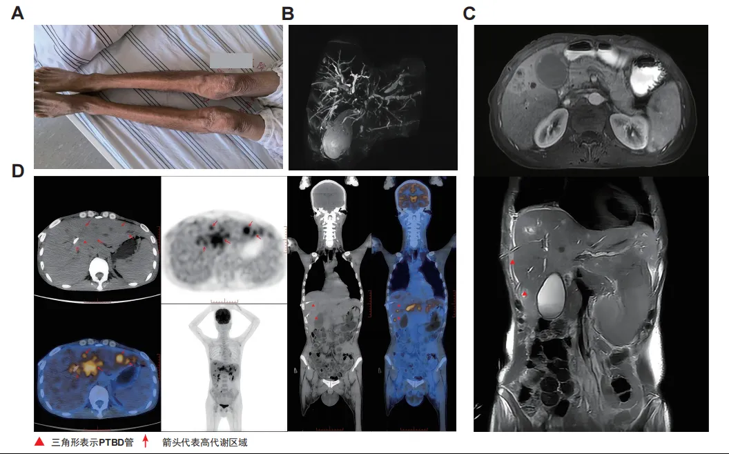 男性,49岁,因黄疸伴持续性上腹痛3月,体重减轻15公斤,就诊于中山大学附属第三医院感染科门诊。患者否认慢性肝病或胆石病史,但有长期酗酒史,每天饮酒0.5—1公斤,已戒酒三年。体格检查显示患者处于恶病质状态,腹部膨隆,皮肤和巩膜广泛黄染。其在外院的肝功能显示胆红素显著升高(总胆红素:228.7µmol/L;直接胆红素:147.8µmol/L)。MRI显示肝脏肿块和肝内胆管扩张,因此进行了右前后经皮经肝胆道引流(PTBD)