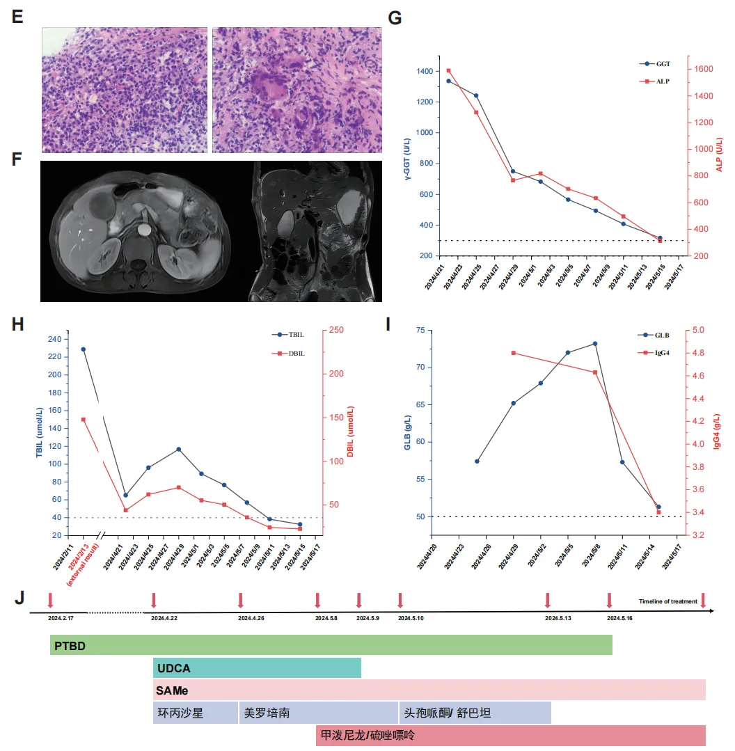 经过一周的治疗,随访MRI显示肝总管、胆总管上段及左右第一至第三级胆管受累显著改善;肝门部肿块和多个肝内结节明显缩小(见上图F)在这一成功的干预后,患者症状明显缓解复查显示,包括γ-GGT、ALP、总胆红素和IgG4水平,均显著下降。CA19-9和CA125水平分别降至624.09U/mL和45.90U/mL(见上图G/H/I/J)。患者随后出院,并继续接受糖皮质激素和硫唑嘌呤的维持治疗