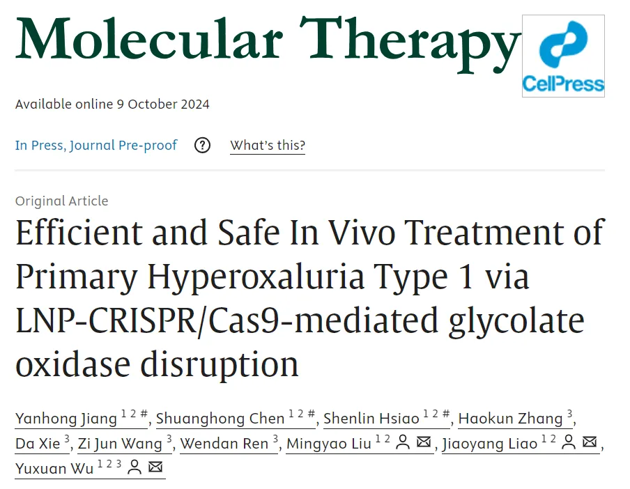 2024年10月,华东师范大学生命科学学院、上海市调控生物学重点实验室的吴宇轩研究员与尧唐生物合作,开发了一种脂质纳米颗粒(LNPs)介导的体内基因编辑策略靶向敲降GO,成功在PH1小鼠体内实现了高效的基因编辑和稳定的降草酸效果。该研究成果以“Efficient and Safe In Vivo Treatment of Primary Hyperoxaluria Type 1 via LNP-CRISPR/Cas9-mediated glycolate oxidase disruption”为题,在线发表在《分子疗法》期刊上。这一创新性方法首次将LNPs介导的体内基因编辑技术应用于PH1的治疗,克服了siRNA频繁给药的困扰及AAV载体的安全性问题,实现了一次给药便可长期获益的效果,为PH1的治疗开辟了新方向。