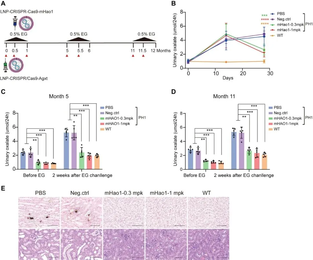为了快速建立PH1模型小鼠,研究团队通过LNPs递送Cas9 mRNA和靶向Agxt的sgRNA,并在小鼠饮用水中添加0.5% 乙二醇(EG),成功建立了PH1小鼠模型,观察到尿草酸水平升高及肾钙质沉着,证实了建模方法的可靠性。随后,研究团队筛选了靶向小鼠Hao1基因的高效sgRNA, 利用LNP和Cas9 mRNA/Hao1-4 gRNA通过静脉注射以低高剂量在PH1小鼠体内验证该治疗策略的有效性。在长达12个月的监测中,治疗组显示出稳定的编辑效率和持久的治疗效果,尿草酸水平均显著下降,且未观察到肾钙质沉着现象,提示该治疗方法能显著缓解PH1表型。