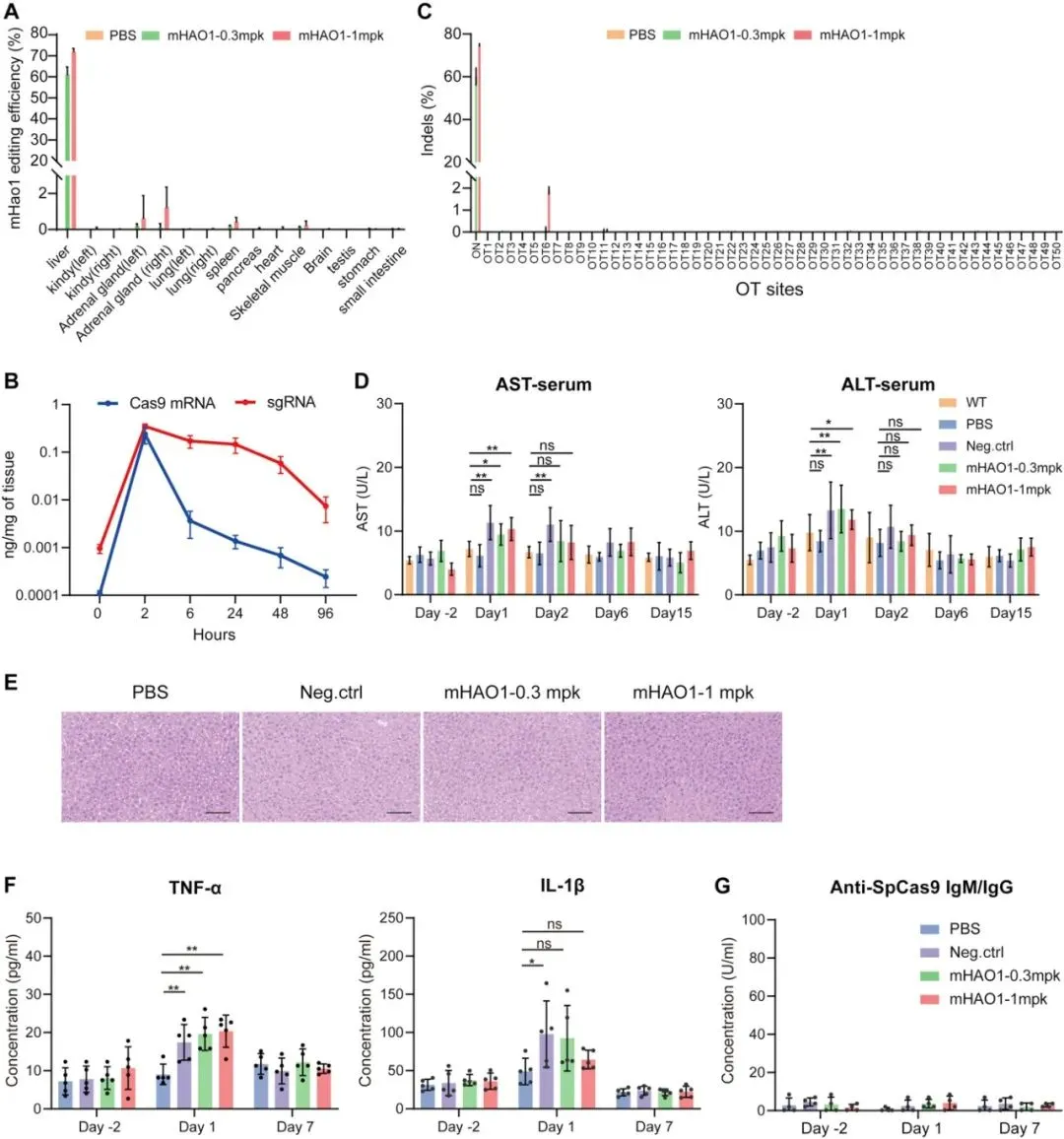 为评估该治疗方法的安全性,研究人员从组织编辑分布、脱靶分析、肝毒性及免疫反应等多个方面进行了全面检测。结果显示,基因编辑活性主要集中在肝脏中,且脱靶效应极小。此外,未观察到肝毒性或免疫反应的发生。这些结果表明,该治疗策略具有良好的安全性,为其临床应用奠定了基础。