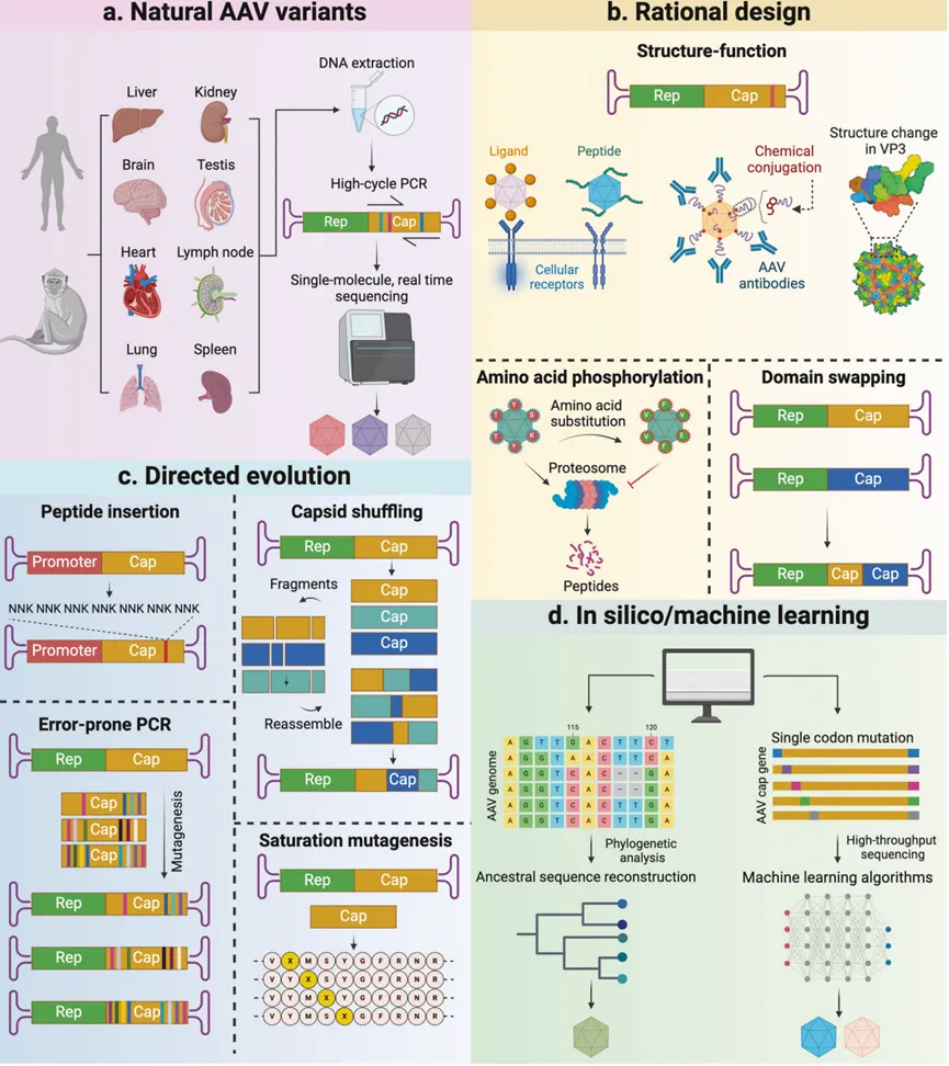 衣壳设计是为不同临床应用开发定制rAAV的主要策略。它主要包括三种方法:鉴定自然存在的AAV变体、理性设计和定向进化(图1)。最近,AI辅助进化已成为rAAV衣壳设计的新工具。