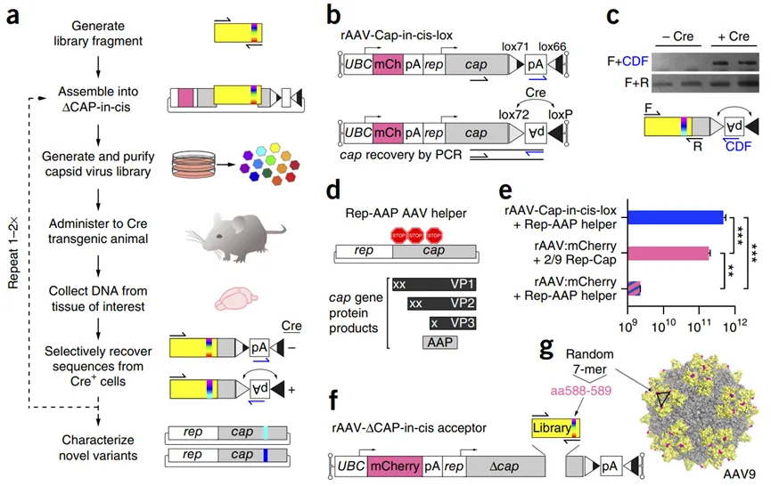 图2  基于Cre从感染的靶细胞中恢复AAV衣壳序列。a  CREATE选择过程示意图。用PCR引入多样性(多色光谱垂直带)到一个衣壳基因片段(黄色),该片段被克隆到携带剩余衣壳基因(灰色)的rAAV基因组中,并用于生成病毒变体库,之后该库被注入Cre转基因动物体内,最后用PCR从Cre+细胞中选择性恢复衣壳序列。b  rAAV-Cap-in-cis-lox rAAV基因组。Cre颠倒了被lox71和lox66位点包围的聚腺苷酸(pA)序列。PCR引物(半箭头)被用来选择性扩增Cre重组序列。c  从两个Cre+或Cre-小鼠中恢复的衣壳库序列的Cre重组依赖性(顶部)和独立性(底部)扩增的PCR产物。d 示意图显示了Rep-AAP AAV辅助质粒内的AAV基因以及由cap基因编码的蛋白质。在cap基因中插入的终止密码子消除了VP1、VP2和VP3衣壳蛋白的表达。e 与用标准的AAV2/9 Rep-Cap辅助质粒+ rAAV-UBC-mCherry(中间)或AAV2/9 Rep-AAP + rAAV·UBC-mCherry质粒(底部)生产的病毒相比,使用分离的AAV2/9 Rep-AAP + rAAV-Cap-in-cis-lox质粒也能生成有DNase抗性的AAV载体基因组(vg)(顶部)(AAV基因组的DNase抗性是AAV在生产、纯化、储存和给药过程中过程中具有较高的稳定性的指标)。f 将7-mer衣壳库克隆到rAAV-∆Cap-in-cis载体中。g  AAV9表面模型显示了7-mer插入在氨基酸(aa)588和589(洋红色)之间的位置。黄色表示用PCR生成的库片段编码的位点(aa 450-592)。