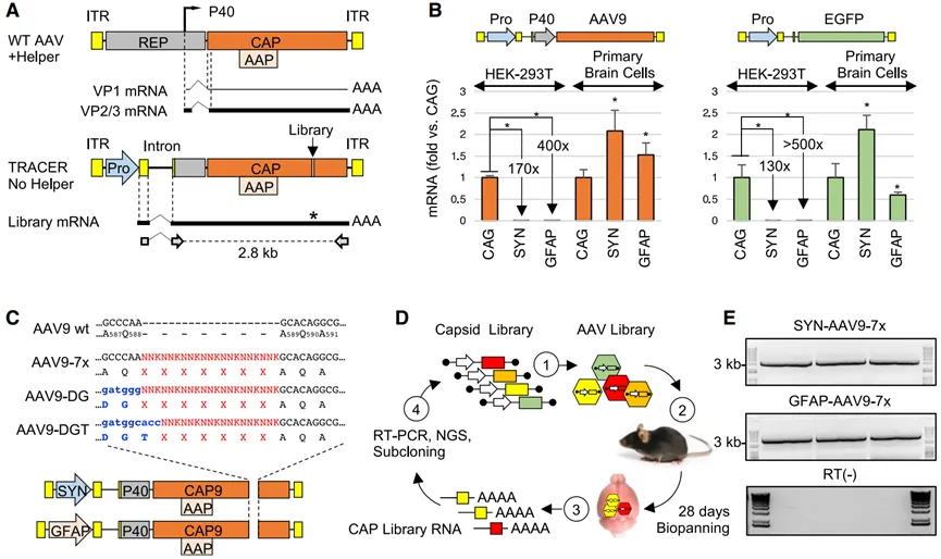 图3 TRACER策略。(A)野生型AAV(顶部)和TRACER文库载体(底部)结构示意图。ITR,反向末端重复序列。Pro,启动子。虚线表示AAV内含子(顶部)或合成的CMV globin内含子(底部),实线代表次要(细线)和主要(粗线)衣壳转录本。底部显示了用于恢复2.8-kb衣壳文库扩增子的引物。(B)在TRACER平台中将CAG、SYN和GFAP启动子串联(左边)或单一启动子(右边)的活性。转基因被包装在AAV9衣壳中,并在HEK293T细胞或小鼠原脑细胞中进行测试(1E+5 vg/细胞,n = 3)。感染后48小时通过实时RT-PCR定量RNA。(C)肽展示文库的构建。在包含SYN或GFAP启动子的载体中,将由AQ、DG或DGT残基引导的随机序列引入至AAV9 VP1的特定位置。(D)体内选择过程示意图。(1)DNA文库用于生产病毒库,(2)将病毒文库通过静脉注射(i.v.)感染小鼠(1E+12 vg/只),(3)注射后28天从整个大脑中恢复大量RNA,(4)通过RT-PCR扩增编码肽库的衣壳片段,通过下一代测序(NGS)进行分析,然后克隆到TRACER载体中进行另一轮选择。(E)在注射SYN和GFAP启动子文库后28天,从三只小鼠中获得的RT-PCR产物示例(顶部和中间,分别)。底部:RT阴性对照。