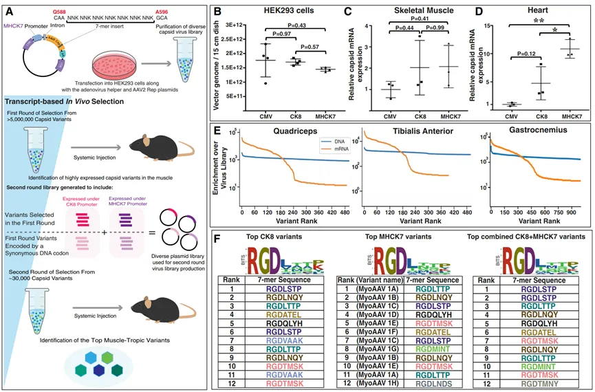 图4 DELIVER鉴定出一类含有RGD基序的肌肉趋向性AAV衣壳变体。(A)使用DELIVER生产病毒文库和选择衣壳变体的示意图。(B)使用含有ITR的质粒产生的rAAV滴度比较,这些质粒在CMV、CK8或MHCK7启动子的控制下表达AAV9衣壳编码序列。(C和D)在8周龄C57BL/6J小鼠的骨骼肌(C)和心脏(D)中,由CMV、CK8或MHCK7启动子控制表达的AAV9衣壳库mRNA的体内表达。病毒库感染方式为系统性注射,剂量为1E+12 vg/只小鼠。(E)图表显示在不同小鼠骨骼肌中,由MHCK7启动子表达的衣壳变体在DNA和mRNA水平上相对于病毒文库的富集情况。(F)在8周龄C57BL/6J小鼠肌肉中注射1E+12 vg病毒库后,经过第二轮基于转录本的选择,高度表达的衣壳变体中7个氨基酸的插入序列。每组中颜色相同的变体由同义密码子编码。变体的排序是基于每个变体在股四头肌、胫骨前肌、腓肠肌、肱三头肌、腹肌、膈肌和心脏中的mRNA表达量之和。