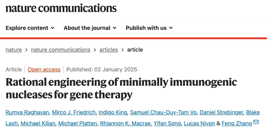 2025年1月2日,张锋团队在Nature Communications期刊发表了题为:Rational engineering of minimally immunogenic nucleases for gene therapy的研究论文。