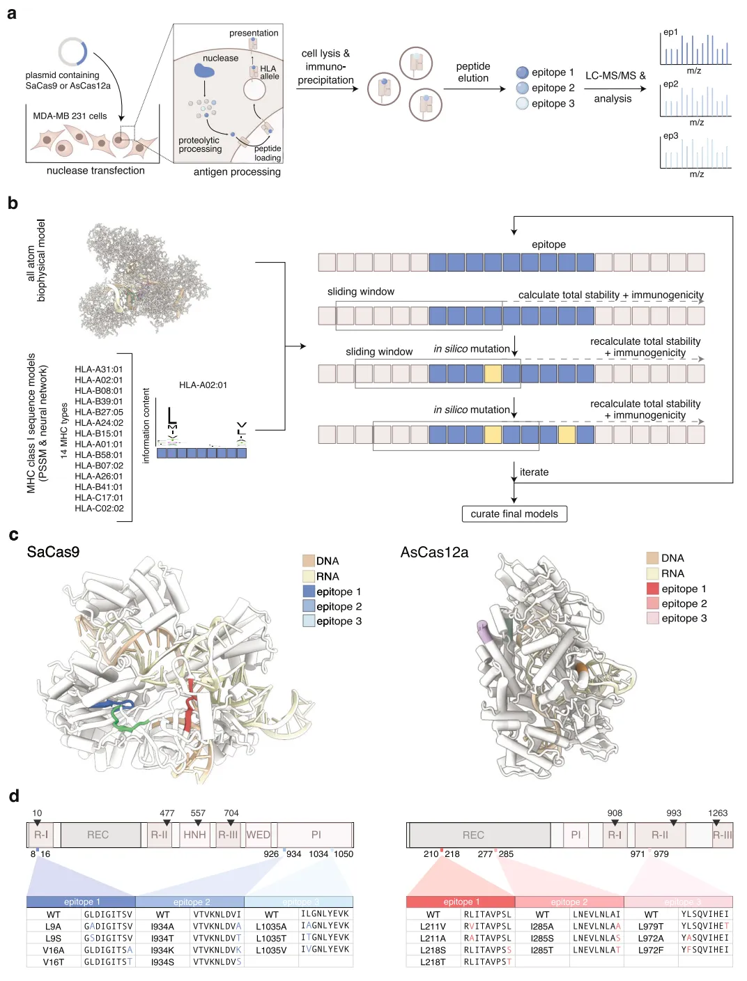 为了解决上述挑战,研究团队对SaCas9和AsCas12a进行了分析,以确定假定的免疫原性表位,然后计算设计了预计可以逃逸免疫检测的突变体。
