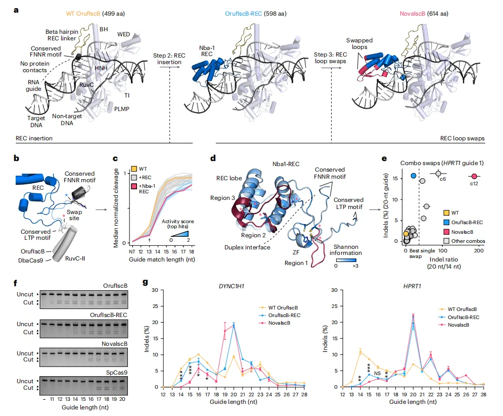 最近发现的专性可动因子导向活性(OMEGA)系统是一类独特的小型RNA导向核酸酶,能够在人类细胞中进行靶向基因组编辑。Cas9的祖先OMEGA-IscB是基因组和表观基因组编辑的特别引人注目的候选物,因为它的尺寸小(~ 300-550个氨基酸(aa)),这使得它更有利于通过腺相关病毒(AAVs)递送;其双核酸酶组成,能够控制哪些DNA链被切割;和它的大结构指导RNA (ωRNA),它提供了支架额外相互作用的界面。此外,OMEGA–IscB与双链DNA(dsDNA)结合形成的开放且可接近的R环,使双链无断裂应用成为可能,如碱基编辑。然而,与使用更长引导序列(~ 17–20 BP)的SpCas9相比,IscBs的特异性可能较低,因为它们的有效引导序列较短(~13 bp)。